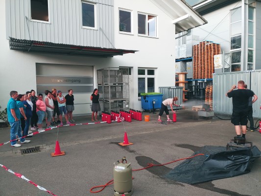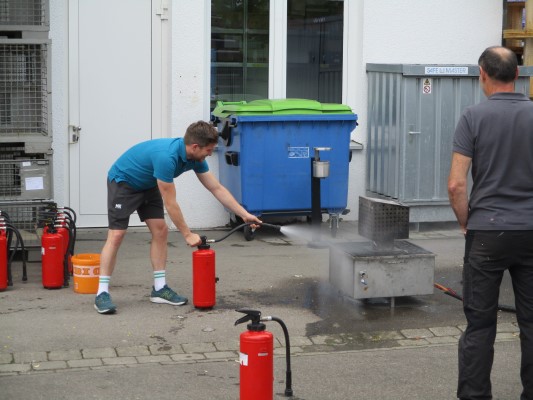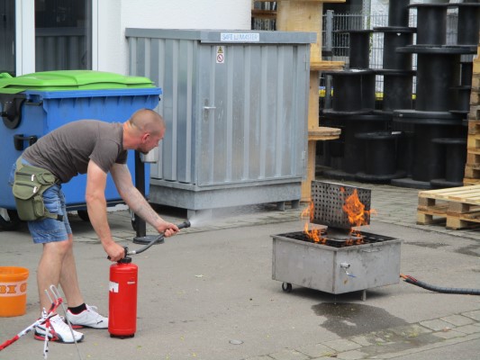 Neben theoretischen Grundlagen bei Ausbruch eines Feuers konnten unsere Mitarbeiter auch praktische Feuerlöschübungen auf dem Firmengelände
